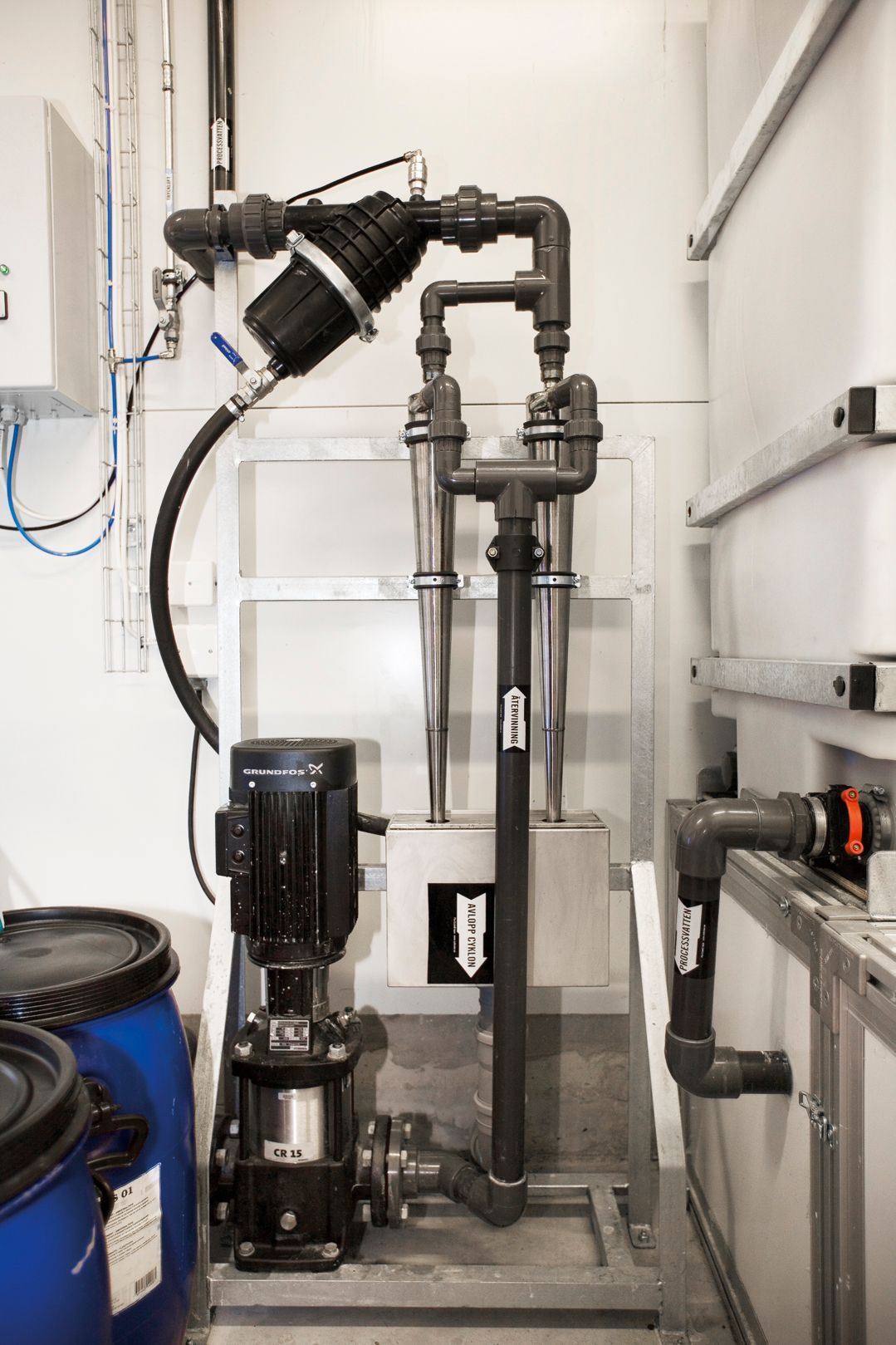 The water passes through hydro cyclones that work as a mechanic purification unit to be processed by Ozone that removes bacteria and bad odor.